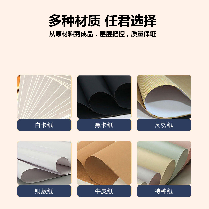 印刷紙張:銅版紙、雙膠紙、啞粉紙、珠光紙、其他藝術(shù)紙(藝術(shù)紙種類較多我們可以免費提供紙樣供您選擇)